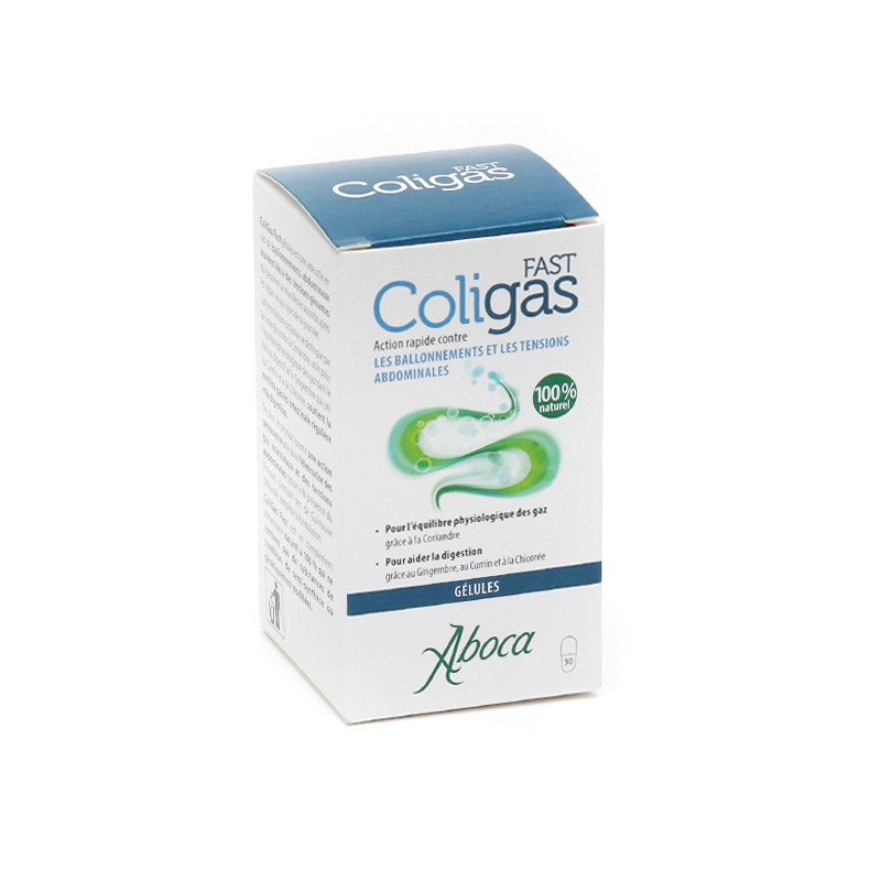 FAST COLIGAS BALLONNEMENTS 30 GELULES ABOCA : complexe actif naturel à base d’extraits lyophilisés conçu pour agir contre les ballonnements et tensions abdominales.