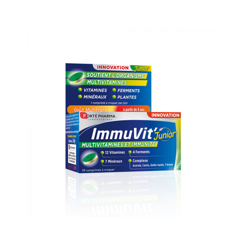 IMMUVIT' JUNIOR 30 COMPRIMES FORTE PHARMA est une association de 12 vitamines + 7 minéraux + 4 souches microbiotiques (200 millions d'UFC**) micro-encapsulées + un complexe à base de 4 plantes.