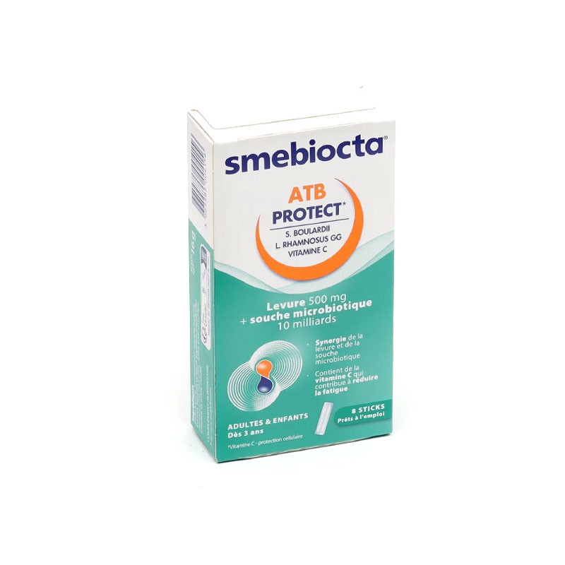SMEBIOCTA ATB PROTECT 8 STICKS IPSEN complément alimentaire à la formule unique composée de 2 souches, rigoureusement sélectionnée et fortement dosée (Combinaison exclusive de 1 levure + 1 souche microbiotique + vitamine C)