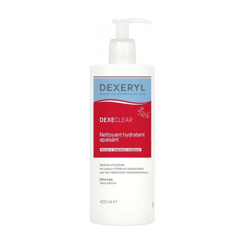 DEXECLEAR NETTOYANT HYDRATANT APAISANT PG 400ML DEXERYL PIERRE FABRE double action pour nettoyer et apaiser la peau sous traitement contre l'acné.