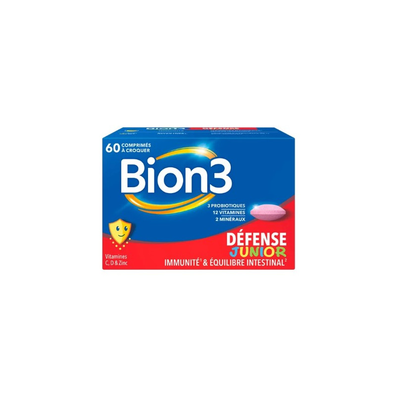 BION 3 DEFENSE JUNIORS 60 COMPRIMES A CROQUER avec édulcorants à base de 3 ferments Tri-Bion®, vitamines et minéraux.