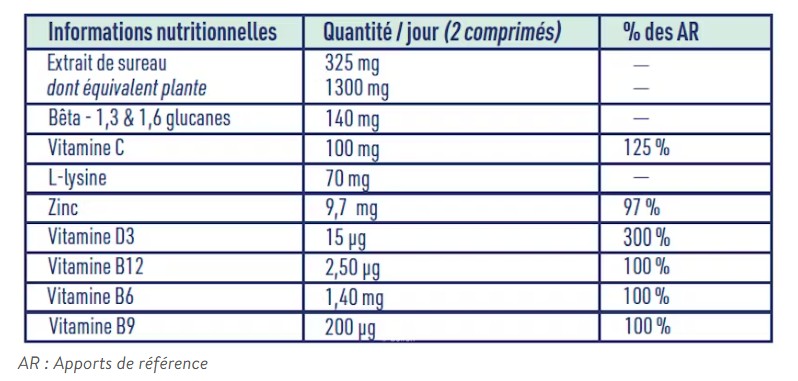 Agent de charge : cellulose microcristalline ; extrait de baies de sureau (Sambucus nigra L.) ; bêta glucanes de levure (Saccharomyces cerevisiae) ; acide L-ascorbique (Vitamine C) ; L-lysine chlorhydrate ; gluconate de zinc ; colorant : riboflavine ; anti-agglomérant : sels de magnésium d’acides gras ; cholécalciférol (Vitamine D) ; cyanocobalamine (Vitamine B12) ; chlorhydrate de pyridoxine (Vitamine B6) ; acide folique (Vitamine B9).