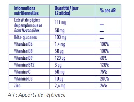 Sa formule experte associe un extrait de pépins de pamplemousse titré en flavonoïdes, des Bêta-glucanes, du Zinc et un complexe de vitamines D3, B6, B8, B9, B12 et C pour répondre aux besoins quotidiens de l’enfant.