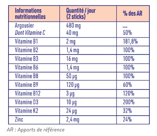 Sa formule experte associe un extrait de baies d’Argousier titré en vitamine C, du Zinc et un complexe complet de vitamines B (B1, B2, B3, B6, B8, B9, B12), D3 et K2.