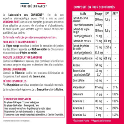 Soulage les jambes lourdes : La Vigne rouge contribue à réduire la sensation de jambes lourdes. Elle est associée aux Bioflavonoïdes de Citrus sinensis et aux extraits de Pépins de raisin.